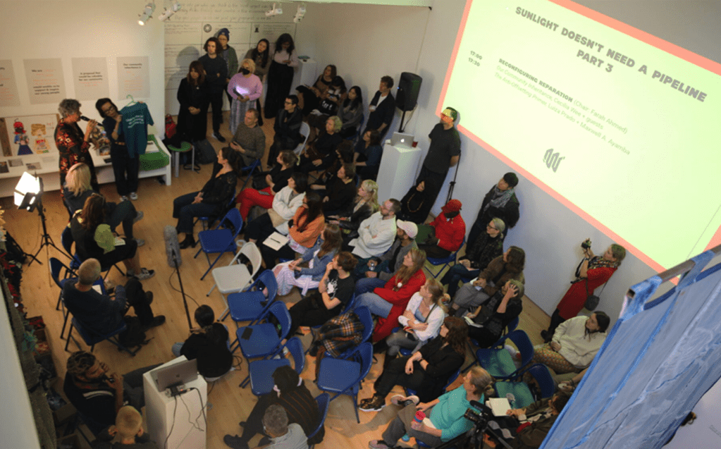 We recognise that the art sector has a history of centralising and extracting knowledge to validate its own authority. We are committed to making art projects, where the voices, opinions and knowledge from those who are most engaged or affected by a subject are for a longer period of time, most affected, most knowledgeable and experienced in this subject is prioritised and that this relationship is conducted in a generative rather than extractive way.